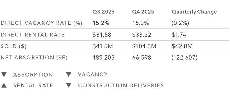 Direct vacancy tightened again in Q4, moving from 15.2% in Q3 to 15.0%, which points to a slow but steady improvement in occupancy. Asking rents increased as well, rising from $31.58 to $33.32, suggesting landlords still have pricing power for well located, high quality space. Leasing activity remains steady, but net absorption cooled to 66,598 SF versus 189,205 SF in Q3. In other words, deals are getting done, but the market saw fewer large move-ins this quarter. Construction costs remain elevated, which continues to affect tenant improvement budgets and the economics of building upgrades.