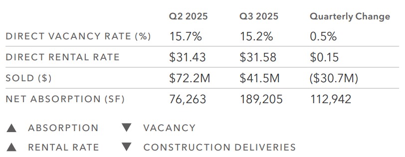 Direct vacancy fell to 15.2%, down from 15.7% in Q2 2025, indicating a slight improvement in occupancy. Leasing velocity remains steady and we’re seeing larger transactions being completed more frequently. We continue to feel the pressure of high construction costs but are starting to see some bright spots in the reduction of labor costs and reduced pressure on pricing from tariffs. We’re hoping to see more positive impact on the market from these factors combined with positive economic tailwinds.